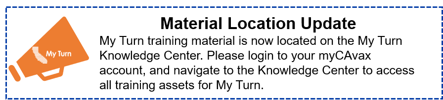 My Turn is a system that gives providers an all-in-one application for vaccine eligibility, public appointment scheduling, walk-in appointments, dose administration, and reporting for vaccine clinics. My Turn supports all recommended vaccines for both pediatric and adult patients.